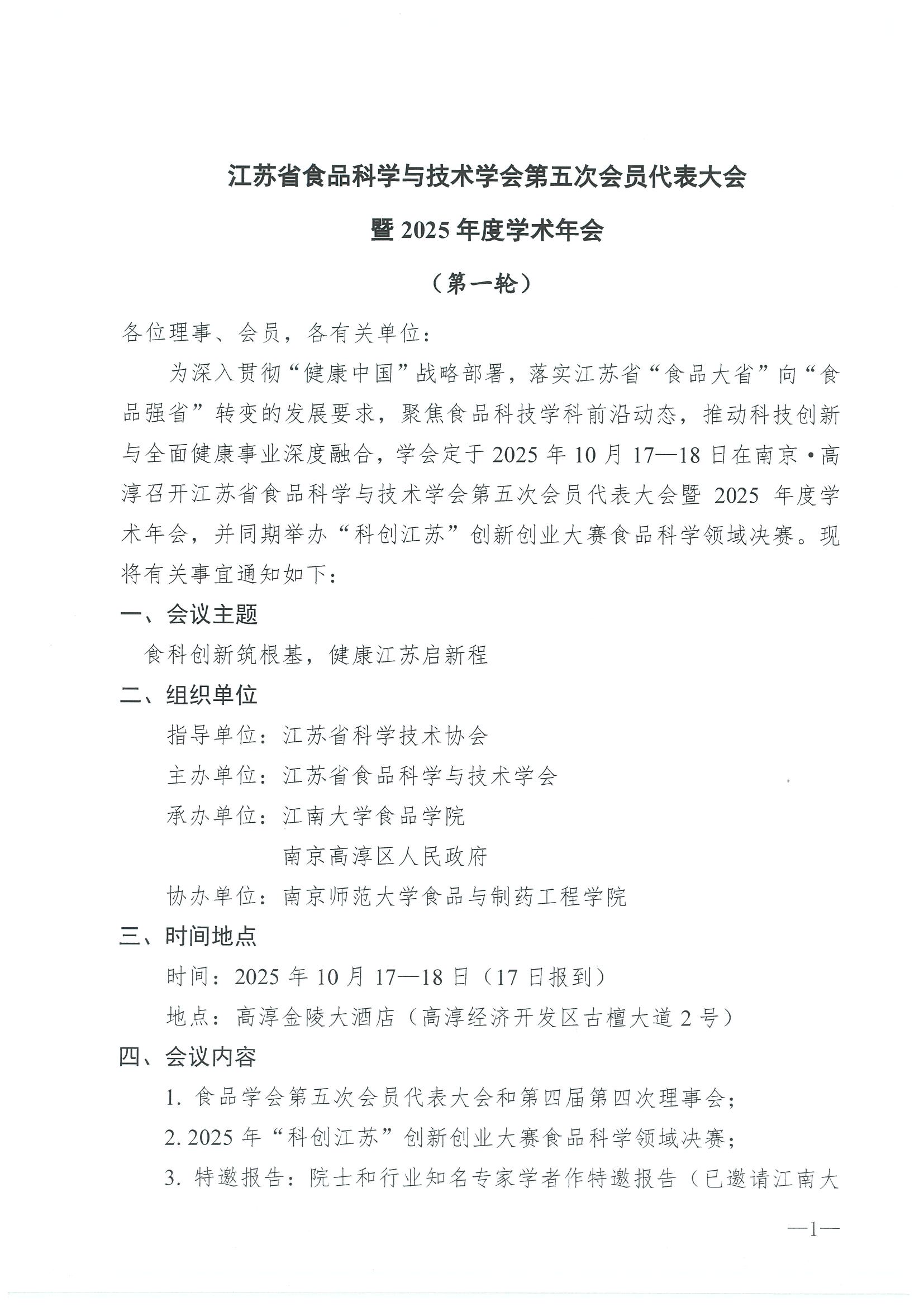 关于召开江苏省食品科学与技术学会第五次会员代表大会暨2025年度学术年会的通知(第一轮)
